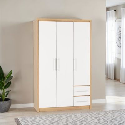 Seville 3 Door 2 Drawer Wardrobe - White High Gloss/Light Oak Effect Veneer